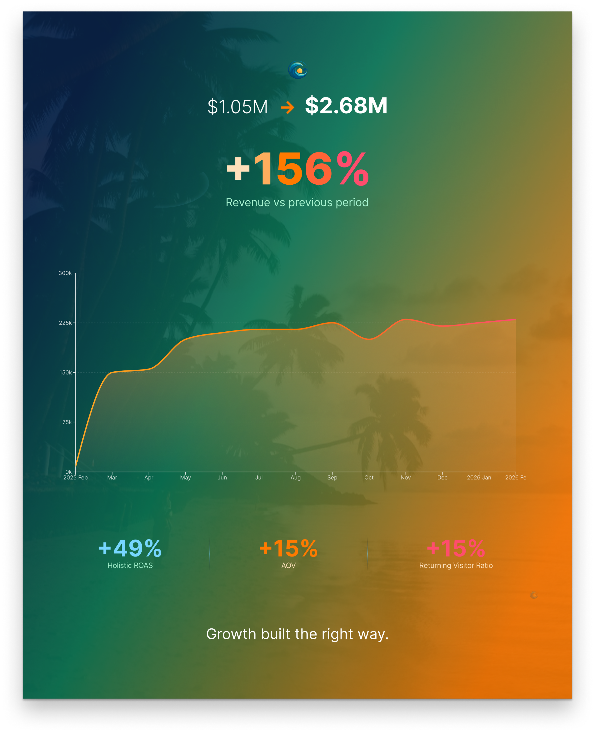 Revenue: $1.05M → $2.68M (+156%) | Ad Spend: $613K → $1.06M (+72%) | Holistic ROAS: 1.71 → 2.54 (+49%) | AOV: $39.95 → $45.88 (+15%) | Returning Visitor Ratio: 9.53% → 10.93% (+15%)